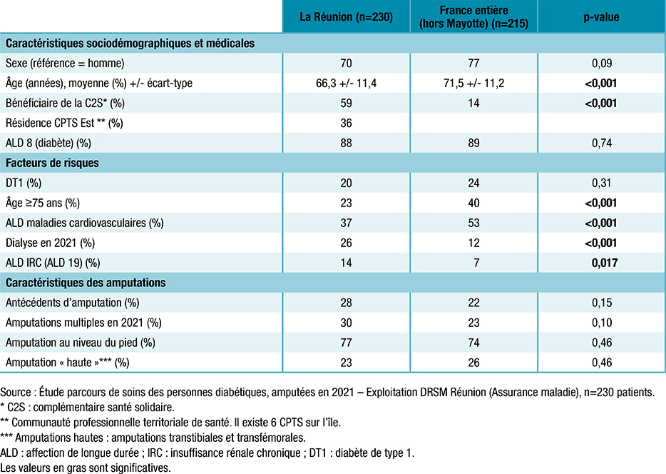 Tableau : Caractéristiques des personnes vivant avec un diabète et de leurs amputations, La Réunion et France entière (Échantillon