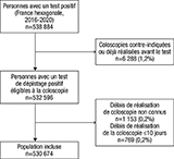 L’étude porte sur les individus avec un résultat positif au FIT en France hexagonale entre 2016 et 2020. La réalisation ou non de la coloscopie à chacun des trois temps était recueillie. Des modèles de régressions logistiques ont été ajustés pour estimer les facteurs associés à la non-réalisation de la coloscopie.