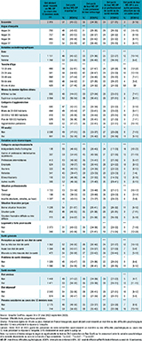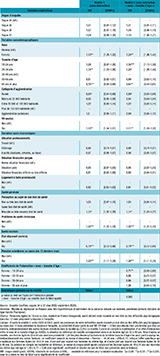 Enfin, les variables relatives à l’état de santé correspondaient à la perception de son propre état de santé général en trois modalités (bon ou très bon, assez bon, mauvais ou très mauvais) et à la présence d’un problème de santé chronique (oui vs non), à travers des items issus du mini-module européen 10. Concernant la santé mentale, les facteurs étudiés portaient sur la présence d’un état dépressif ou d’un état anxieux au moment de l’enquête (deux variables distinctes, correspondant relativement à un score strictement supérieur à 10 sur la sous-échelle dépression ou sur la sous-échelle anxiété de la Hospital Anxiety and Depression scale (HAD) 11) ; ainsi que la survenue de pensées suicidaires au cours des 12 derniers mois : « Au cours des 12 derniers mois, avez-vous pensé à vous suicider ? » (oui/non).