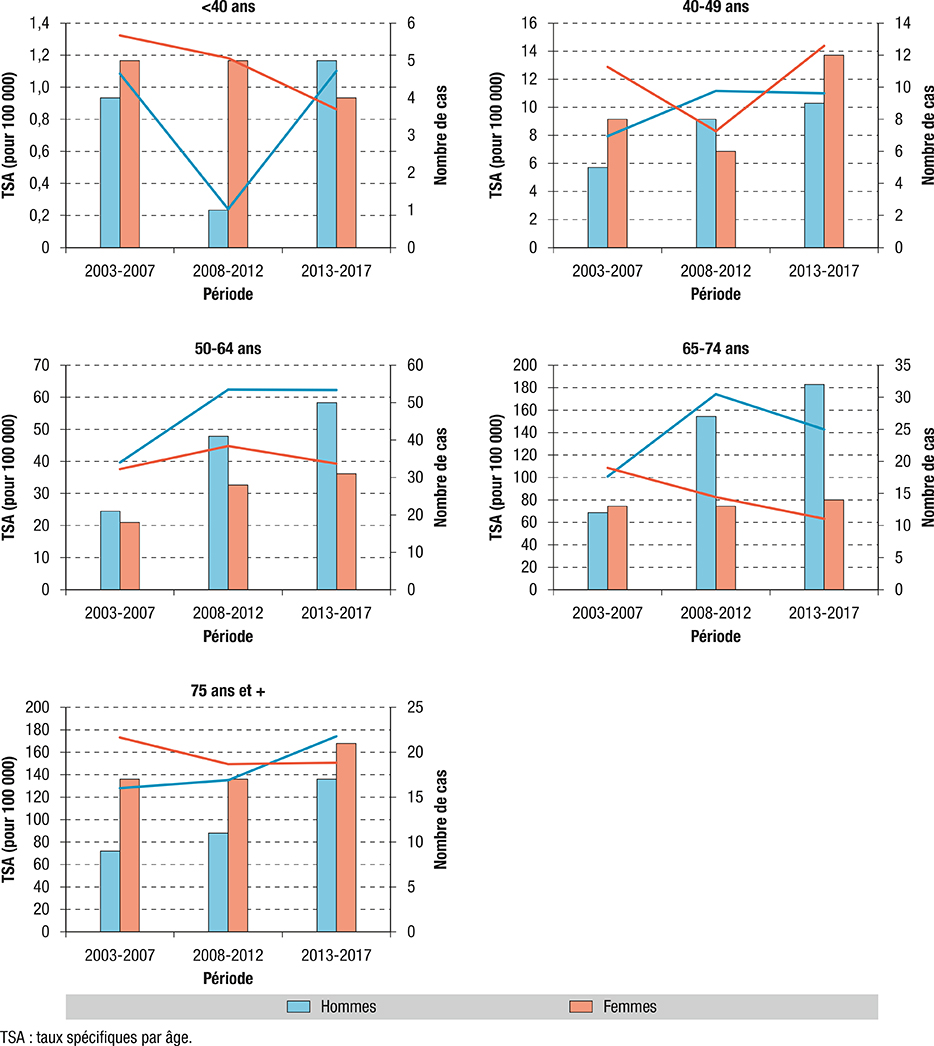 Figure 1 : Analyse temporelle des taux spécifiques d’âge (TSA) et du nombre de cas de cancer colorectal par sexe et périodes